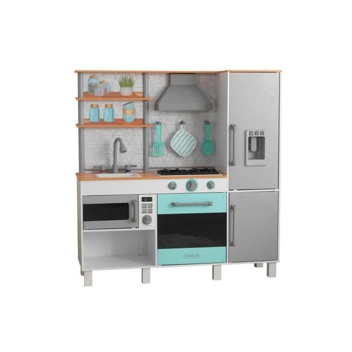 The KidKraft Gourmet Chef Play Kitchen offers a modern design with interactive features like clicking knobs, a spacious refrigerator with ice maker, and a removable sink for easy cleanup. Its EZ Kraft Assembly™ ensures a swift and straightforward setup, making it perfect for young aspiring chefs.