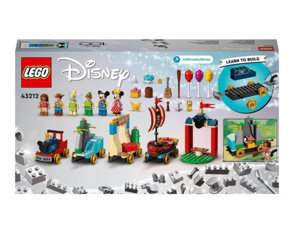 LEGO Disney Celebration Train 43212 – a vibrant 200-piece train set celebrating Disney’s 100th with engine, station, three floats and six iconic minifigures.