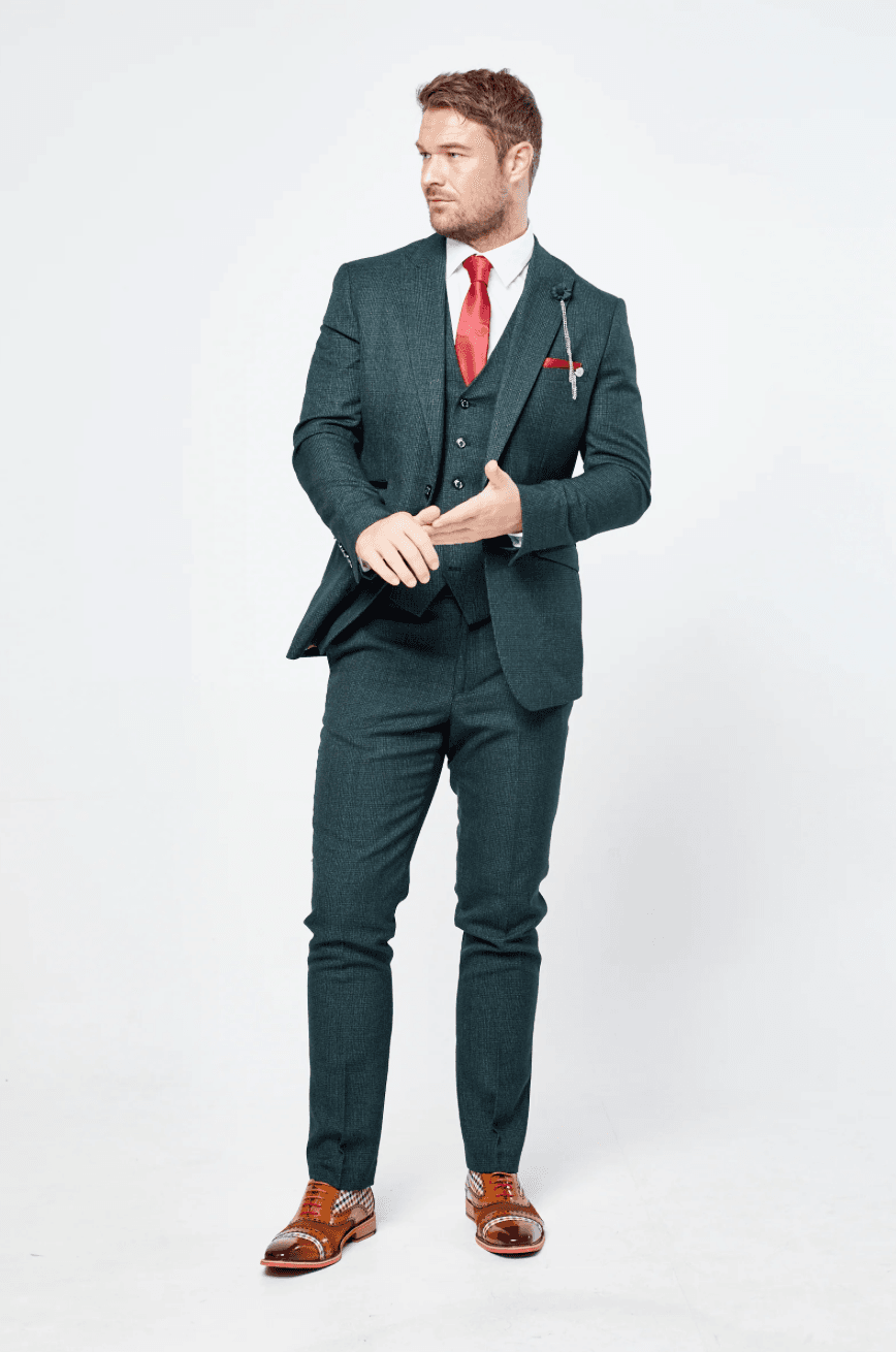 The Caridi Olive Check Three-Piece Suit brings timeless elegance with a distinctive twist. Crafted from a premium blend that combines durability with refined appearance, it includes a sharply tailored blazer, a coordinating waistcoat, and matching trousers. The muted olive hue is contrasted by a classic check pattern, giving this suit character without overpowering. Designed for formal occasions, weddings or standout style, it pairs seamlessly with crisp shirts or muted knitwear, depending on how dressy or relaxed you’d like to go.